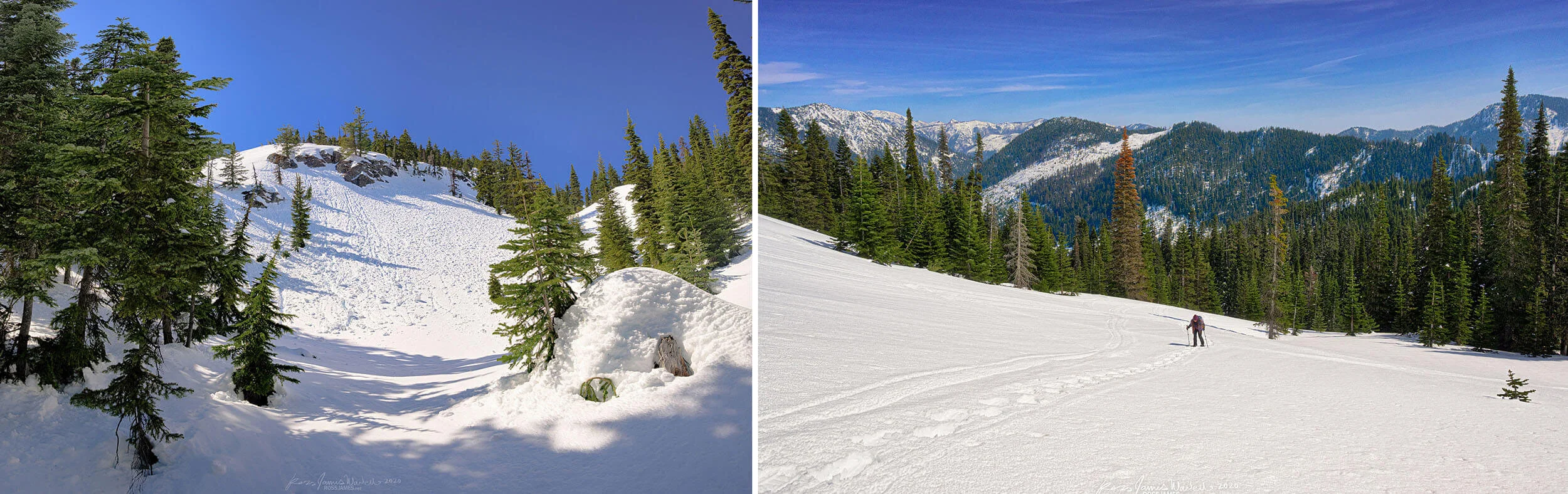 Recent warmer days had melted snow leaving lots of streams flowing at spots up to 8 feet below our feet. Navigating to safe routes, being aware of fallen trees under the snow, and deep tree wells were all on my mind while blazing our own trail.